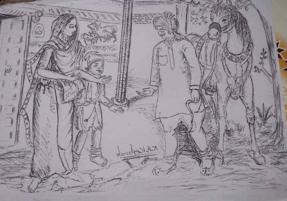 ‘બાપુ ! તમે ઘરેથી નીકળ્યા ત્યારે અમારાં આઈ તમારા ખડિયામાં કોરીની કોથળી મૂકતાં ભૂલી ગયેલાં એટલે મને પાછળ મોકલ્યો !’ એમ કહીને કાળુએ પિતાની તરફ કોરીની કોથળી લંબાવી.