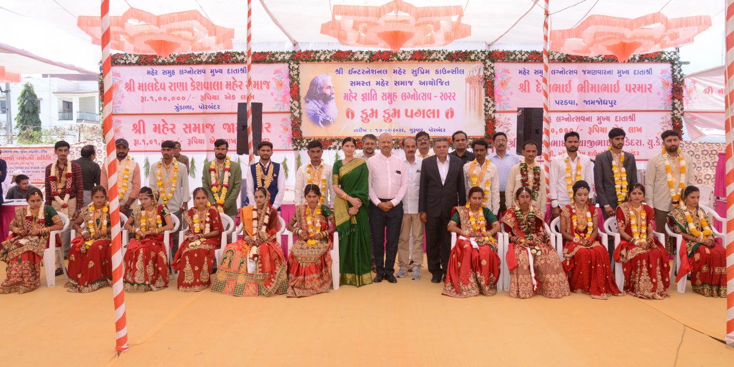 સમસ્ત મહેર સમાજ-શ્રી ઈન્ટરનેશનલ મહેર સુપ્રિમ કાઉન્સિલ આયોજીત મહેર જ્ઞાતિના ૨૧માં સમુહ લગ્નોત્સવ ૨૦૨૨ “ કુમ કુમ પગલાં” શિર્ષક હેઠળ પોરબંદર ખાતે સવંત ૨૦૭૮, મહાવદ-૧ તા. ૧૭/૦૨/૨૦૨૨ને ગુરૂવારના શ્રી મહેર વિધાર્થી ભવન પાસે, એરપોર્ટ રોડ, માધવાણી કોલેજની સામે વિશાળ ગ્રાઉન્ડમાં યોજાઈ ગયો. મહેર સમાજના દાતાઓ, રાજકીય આગેવાનો,સંતો મહંતોની ઉપસ્થિતિમાં યોજાયેલા આ સમુહ લગ્નોત્સવમાં ૨૧ જેટલા નવદંપતિઓએ પોતાના લગ્નજીવનના પ્રભુતામાં પગલા માંડયાં હતાં.અને જ્ઞાતિના આગેવાનોએ આ રૂડા અવસરે આર્શિવાદ પાઠવ્યાં હતાં. વિવિધ કાર્યક્રમમમાં અગ્રેસર એવા શ્રી ઈન્ટરનેશનલ મહેર સુપ્રિમ કાઉન્સિલ આયોજીત મહેર જ્ઞાતિ સમાજનો સમુહ લગ્નોત્સવ સમારોહ ૨૦૨૨ શાનદાર રીતે ઉજવાયો હતો.
